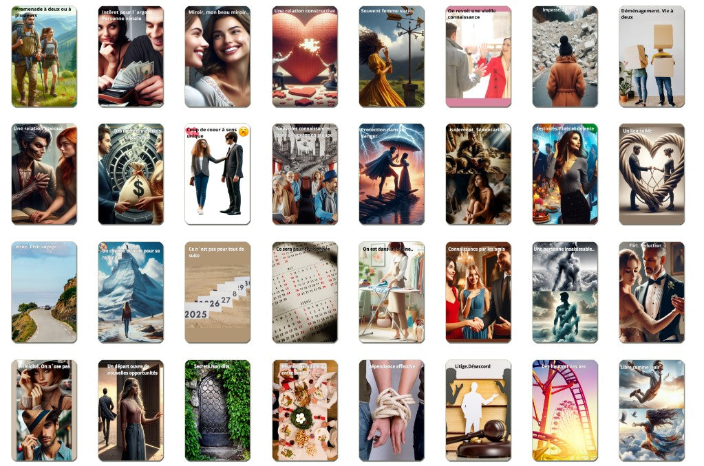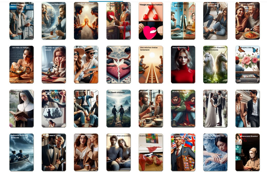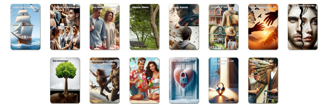 Cet oracle de 110 cartes est pour des tirages sentimentaux. Je l´ai mûrement réfléchi de façon à ce qu´il donne des réponses les plus claires possibles et différents types de personnes et de situation. Cet oracles est équilibré entre les cartes de bonheur et celles de désillusions..